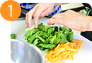 小松菜は4~5cmに切り、人参は細くせん切りにする。