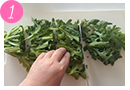 春菊は洗って水気をとり、根の部分1cmほどを切り落とし、4等分の長さに切る。