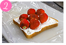 いちごを真ん中と四隅にのせ、上に生クリームをぬり広げる。