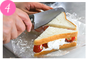 包丁を温め、パンの耳を切り落とし、4等分に切る。