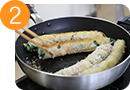 1に小麦粉を両面にまぶし、溶き卵→パン粉の順に衣をつけて、揚げ焼きにする。
