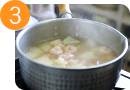 鍋に1を入れ、水を加えて、冬瓜の臭みやアクを取り除くために水から5~6分茹でる。